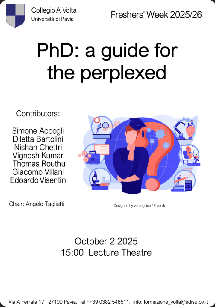 Giovedì 2 ottobre, alle ore 15:00 presso la Lecture Theatre, il Collegio Volta organizza un incontro speciale dedicato al mondo del dottorato. Un’occasione unica per scoprire questa importante opportunità formativa direttamente dalla voce di chi la sta vivendo.